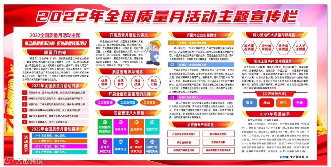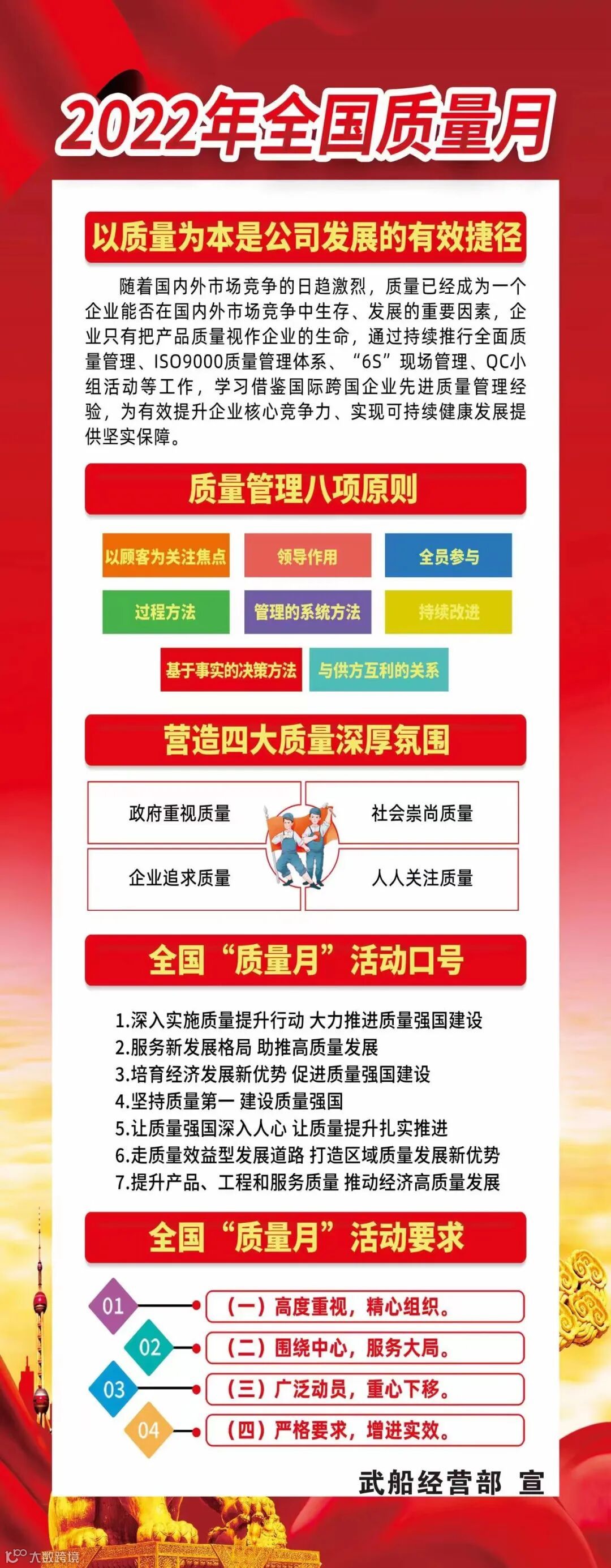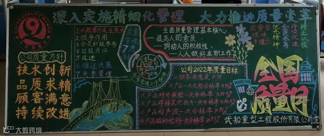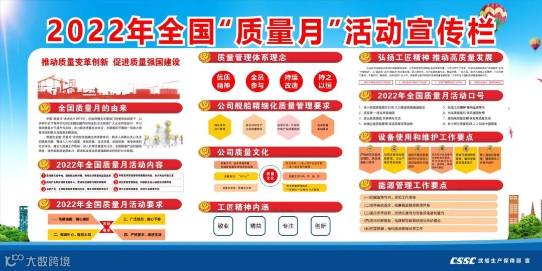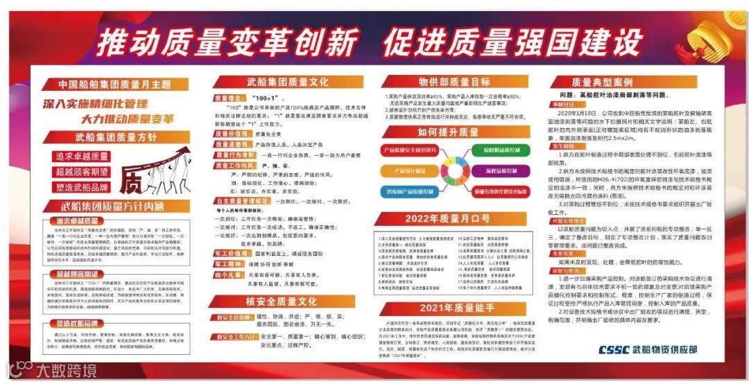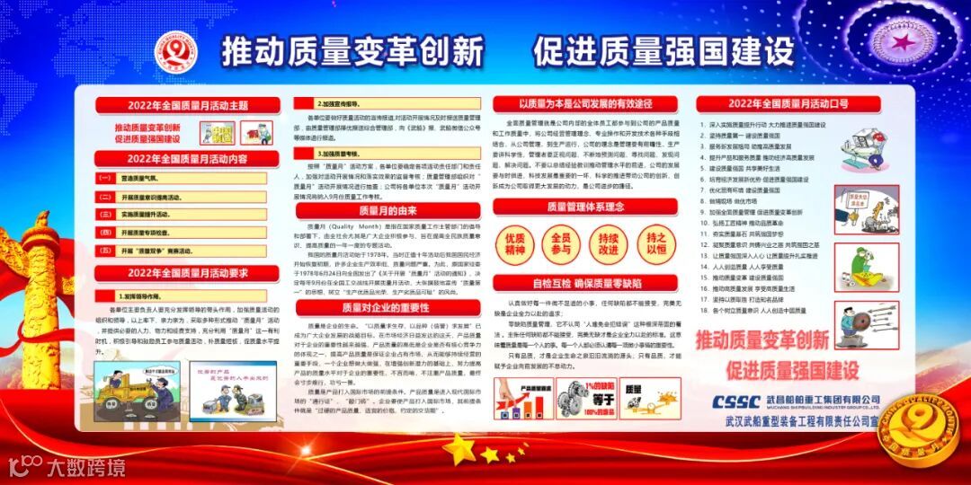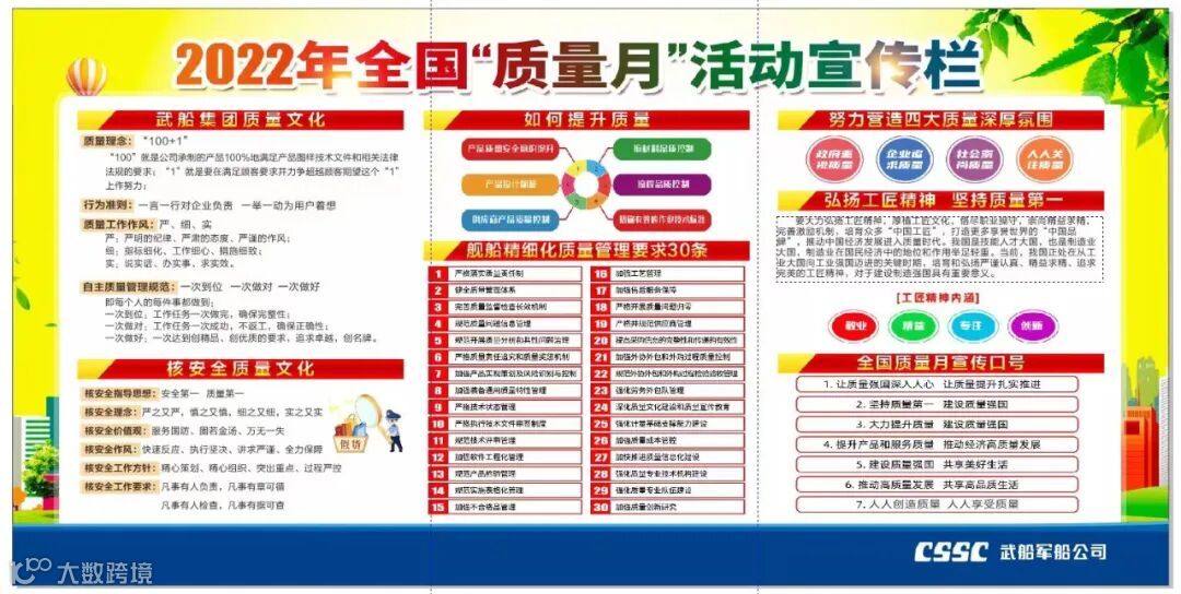 9月,中国船舶武船启动了第45个全国质量月活动。活动期间,公司各单位积极组织参与,结合本年度质量月口号、公司质量文化、核安全文化、质量典型案例、质量工作先进经验和优秀事迹等制作了质量宣传展板,营造了良好的质量氛围。