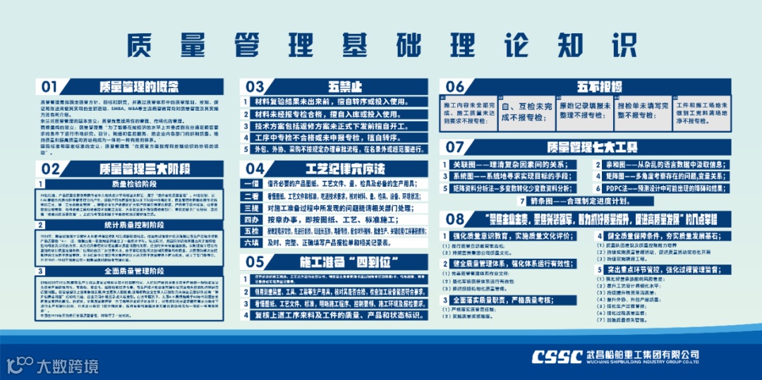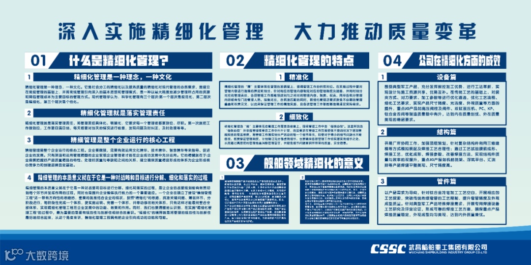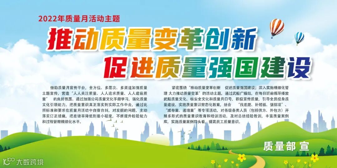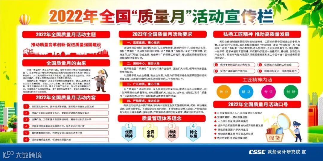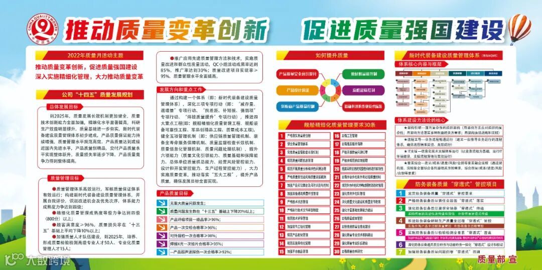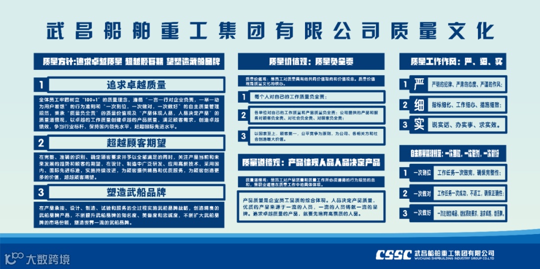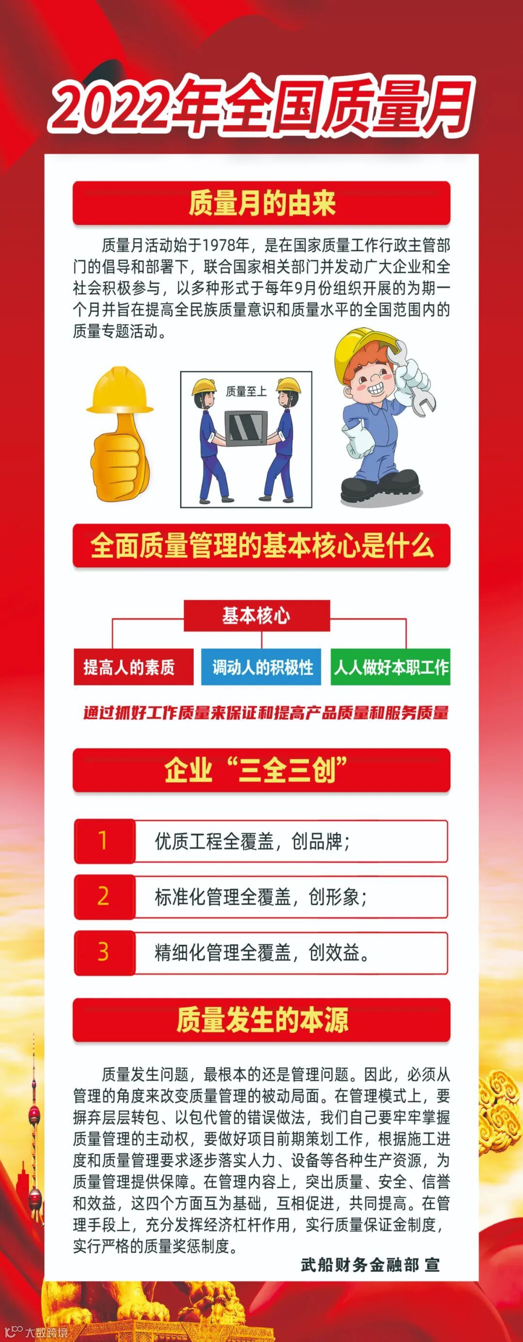 9月,中国船舶武船启动了第45个全国质量月活动。活动期间,公司各单位积极组织参与,结合本年度质量月口号、公司质量文化、核安全文化、质量典型案例、质量工作先进经验和优秀事迹等制作了质量宣传展板,营造了良好的质量氛围。