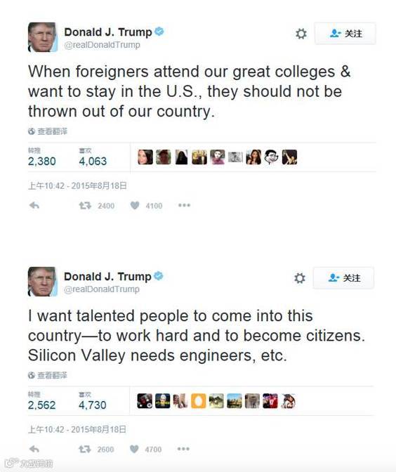 川普一直以来的选举口号都是“ Make America Great Again" (“美国复兴”)和 “美国优先”,而对于移民和外来工作者他的态度向来不是很友好。今年三月份,川普曾说“H1B签证可不是高技术类签证也不是移民签证,它就是用来替代美国人的廉价临时雇佣人员。从其8月的twitter,他对待移民的激进态度仍显而易见: