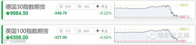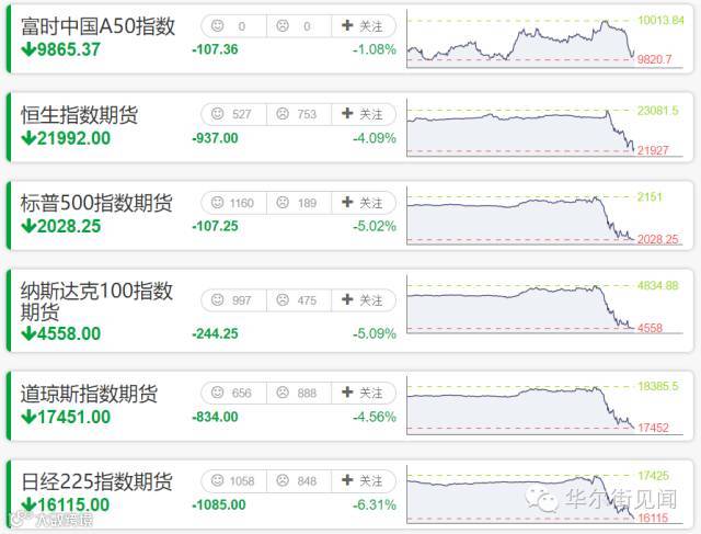 全球主要的指数期货走势惊人的一致,如下图所示,纷纷跳水大跌,标普500指数期货、纳指100期货均已触发熔断,午后13:30左右开始跌幅缩小。