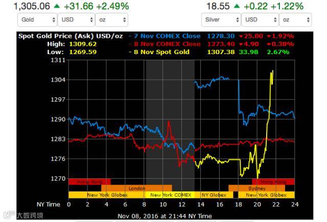 美国大选进入最后一日,希拉里与特朗普选情胶着,全球避险情绪高涨,金价波动剧烈。(见下图)