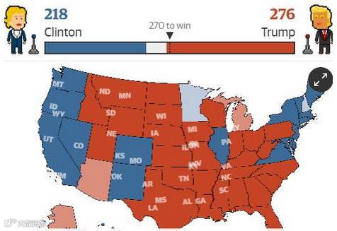 特朗普以276票对战希拉里218票,在美国总统大选中胜出,成为美国第45任总统。他也将是超过60年来,首位从未有过州长或国会议员资历的美国总统。