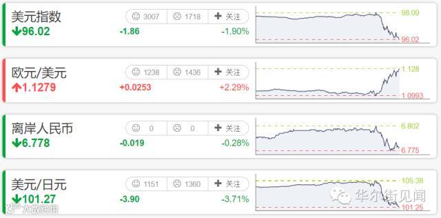 美元指数跌幅1.9%,创8月以来最大跌幅。欧元/美元涨逾2.2%,创2015年12月来最大涨幅。美元/日元跌破102日元关口,一度下跌3.7%。