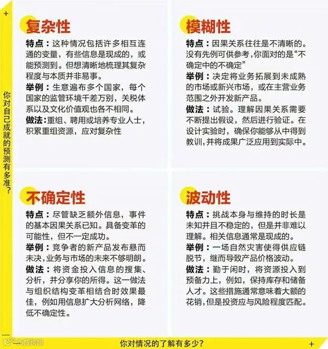 VUCA中每个元素的深层含义,是用来提高VUCA的的预见性和洞察力的战略意义,以及要提高组织和个人在企业中的行动力。