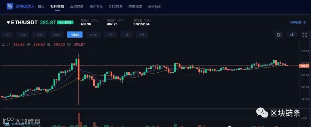 区块链达人Coinicle-ETH 1小时K线(11:00),报价395.87美元,日内涨幅0.15%。