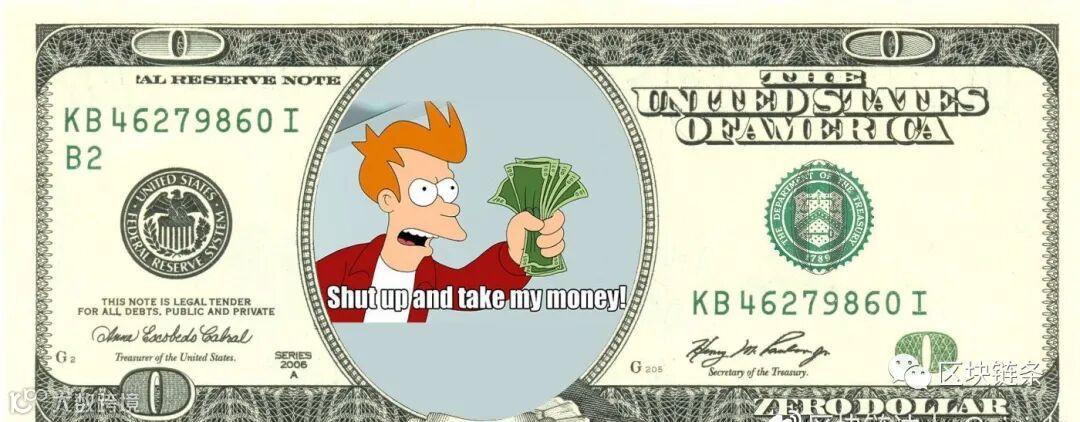 部分的区块链艺术结合对法定货币的反讽,或是对比特币起源的反思。譬如中国中央美术学院毕业生刘嘉颖的《零美元》系列就出现不少欧美常见的迷因(Memes),加密艺术家Trevor Jones的《Satoshi》虽然画出了多利安中本的样子,但这幅画的重点为展示传统投资与比特币新型投资的融合现象,巨幅头像背后的报纸信息量巨大,这幅画作最后以27.5ETH卖出,并被收藏于Somnium Space加密博物馆。
