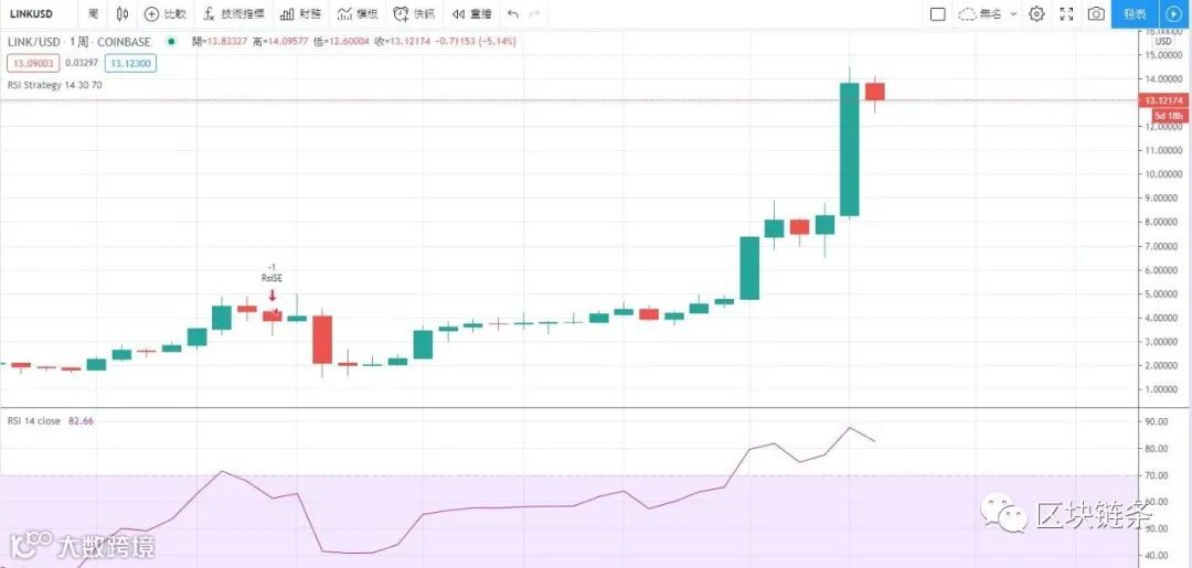 根据TradingView周线行情,LINK币在今年有了极大的成长,2020年初迄今,该币从1月开盘1.79美元上涨至8月10日收盘13.49美元,涨幅高达653%。