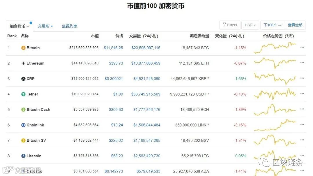 全球市值前100加密货币排行(部分),截自CoinMarketCap。