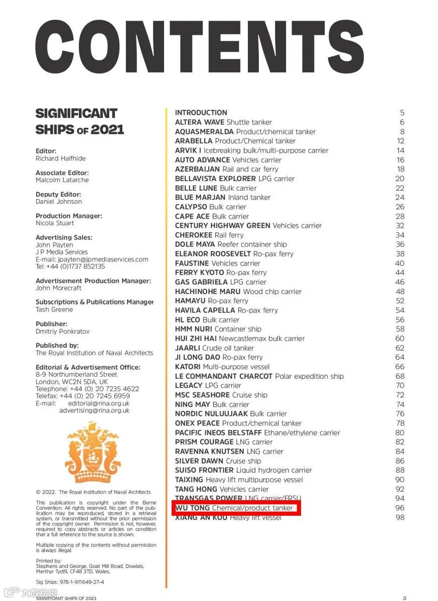 近日,英国皇家造船工程师协会发布了2021年度杰出船型名录《SIGNIFICANT SHIPS OF 2021》,收录了全球各船厂去年交付的43型杰出船型。其中,由中国船舶武船集团建造的7200载重吨双相不锈钢化学品船“梧桐”轮荣列其中。