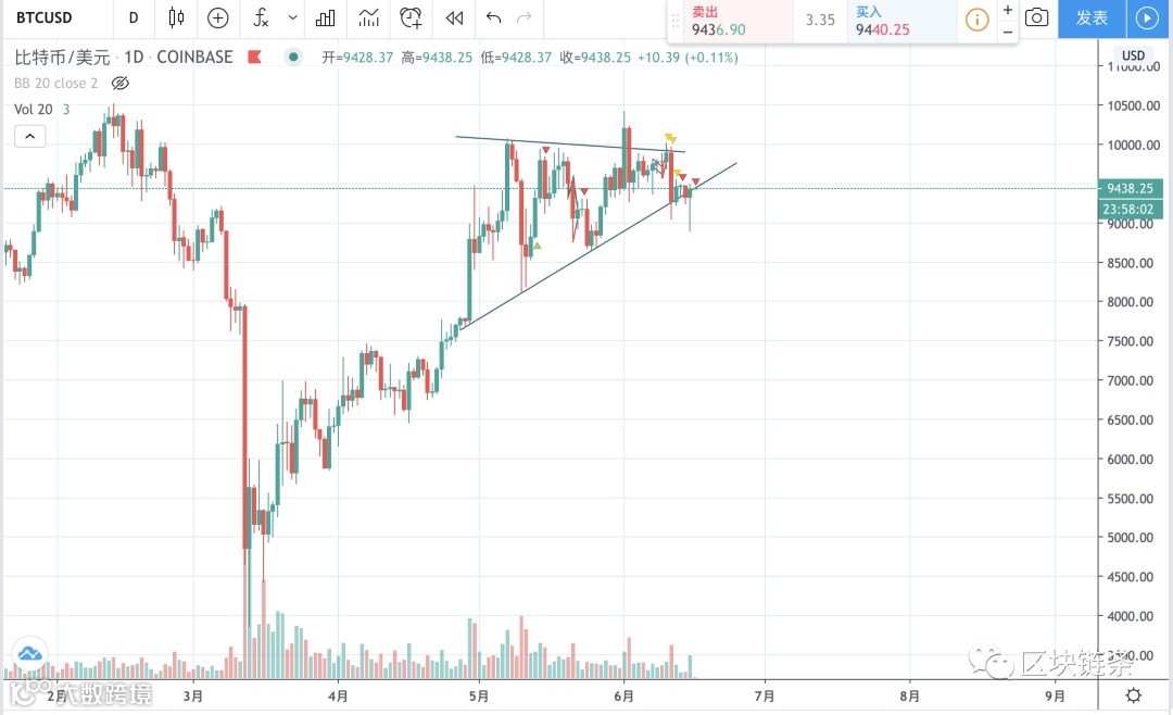 昨天白天,比特币一直处于下跌状态,在下午2点附近Coinbase价格最低跌到8895美金,此处买盘相当强劲,很快便收复了9000美金的跌幅,晚间借助美股的反弹,创出了日内新高,一度达到9500美金。