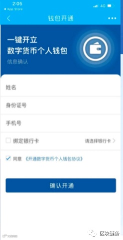 3、点击”创建数字货币钱包“后,填写相关信息并绑定建行账户,勾选协议,点击确认开通;
