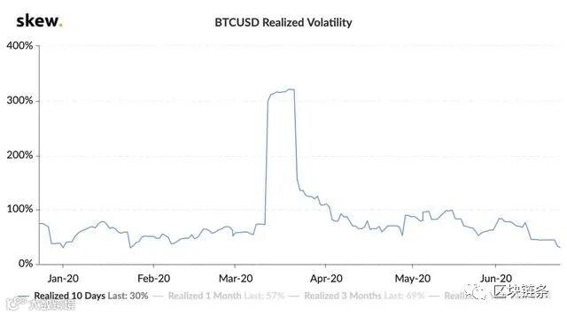 数据提供商Skew说,比特币的实际波动率降至30%,为今年以来的最低水平。因此,自6月12日低波动上一次突破以来,由此产生的平静终于首次结束。