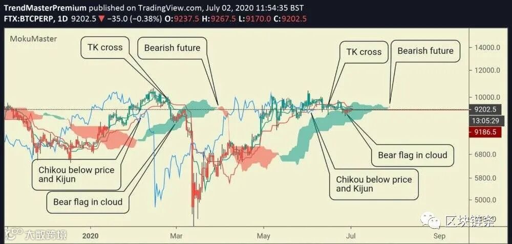 5月至7月,比特币的滞后线再度出现低于价格与基准线的情形,绿柱跌进上方云,出现红柱,且绿色云也反转变红,很可能是暴跌的暗示。