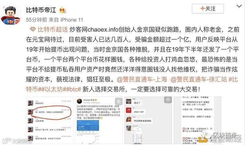 3月30日,据自媒体比特币帝江消息,炒客网chaoex.info创始人金京国疑似跑路。比特币帝江称,金京国圈内人称老金,之前在元宝网待过,目前受害人已达几百人,受骗金额超过一个亿,用户反映平台从19年开始提币出现问题,当时金京国各种推脱,并且在19年下半年还发了一个平台币,花样圈钱。