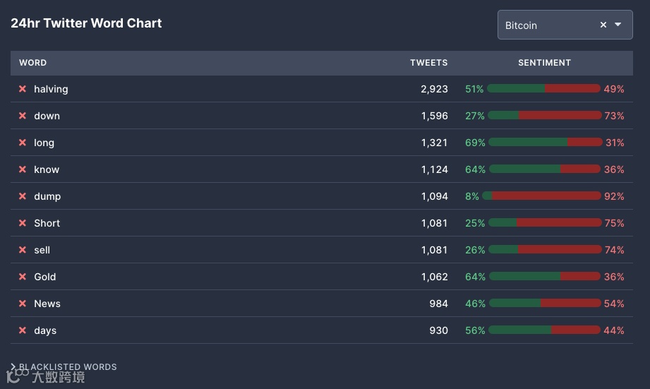 在比特币减半之前的一个月中,减半成为比特币的主要话题,因为它是有关比特币的Twitter对话中使用最多的词。尽管最近比特币价格下跌,但有51%的推文表示比特币减半在今天仍然是正面消息,因为比特币的每日情绪指数从两天前的月低点迅速增加了一倍。