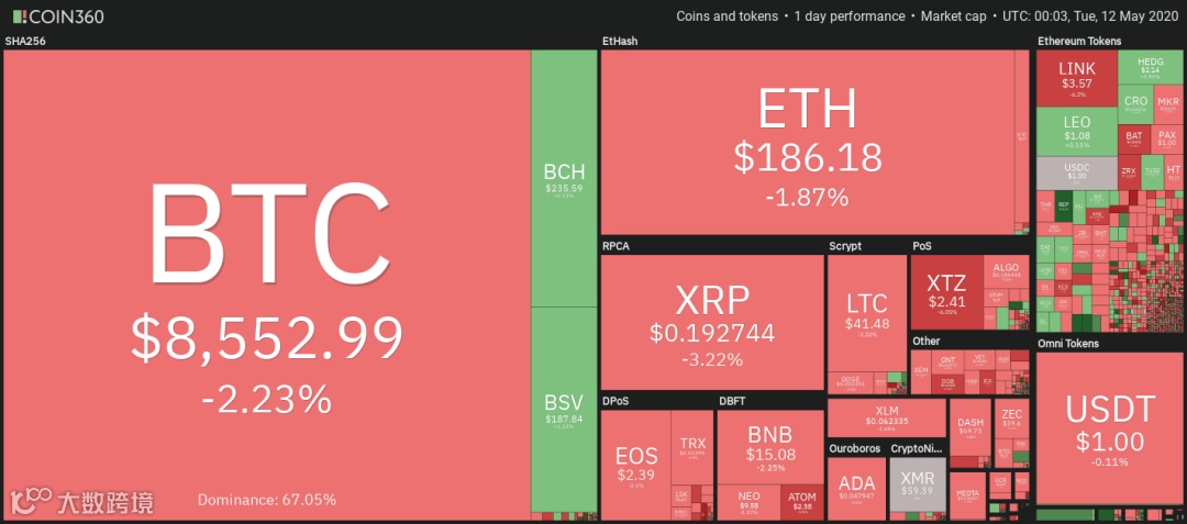 山寨币的表现也很差,因为所有人都盯着比特币减半。ETH下跌1.95%,XRP下跌2.47%,而Tezos(XTZ)目前下跌4.80%。