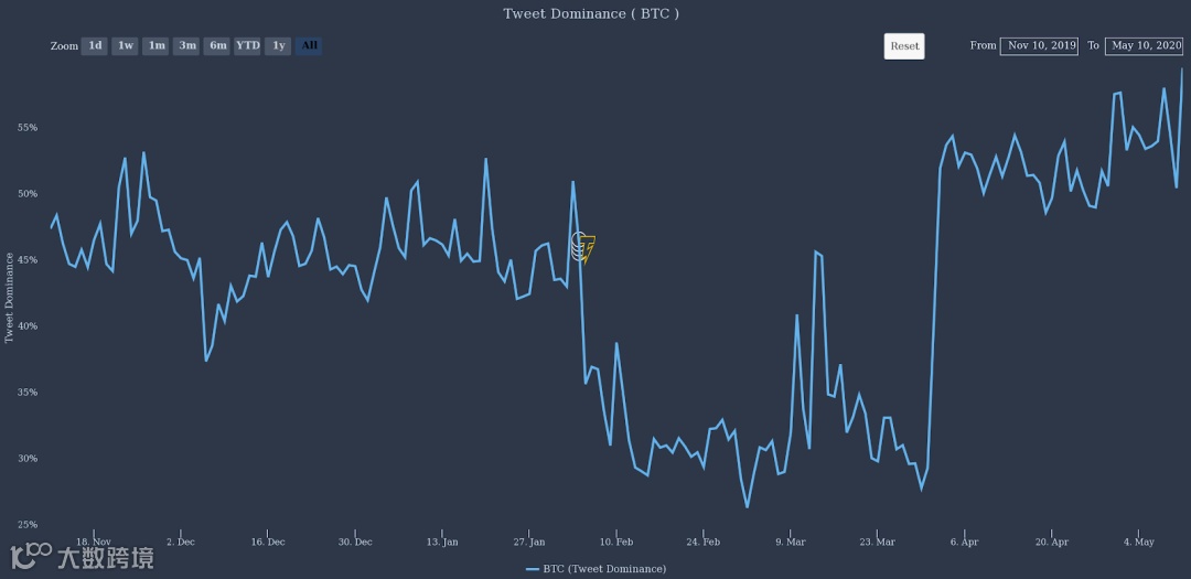 随着减半临近,比特币的推文占比(即单个加密货币在某天占全部加密货币推文的百分比)也飙升至6个月高位。