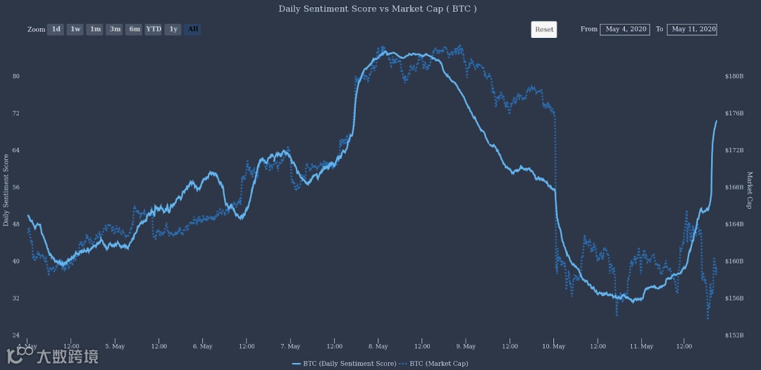 BTC每日情绪得分与市值之比(1周) 来源:TheTIE