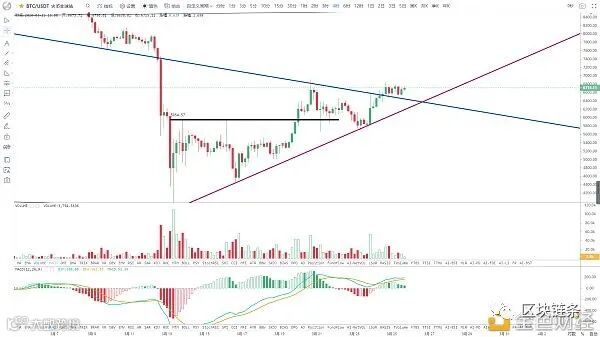 目前来看4小时级别,价格已突破近期整理三角,不过是弱势突破,量能跟不上,突破后也并未迎来大幅拉升,目前处于原三角上边线附近小幅波动,目前这个位置,想大幅上拉突破前期高点,必须增量,而如果目前缩量上行,极易形成顶背离结构,目前4小时MACD多头量柱逐步衰减至0轴,快慢线由上行转走平,其余指标也都显示上行动能的不足,均线上价格已站上5日和10日均线,目前位于20日均线附近震荡,5日线走平,20日线依旧保持向下姿态,近期的反弹并未扭转20日线向下的趋势,意味着很难发动上涨周期较长的行情,下跌的主旋律并未改变,在这种情况下,就要服从大趋势过滤小趋势的影响,只要20日线不向上拐头,后续价格进行调整的概率还是较大的,目前还是不要盲目去追涨,阻力7000美金,小支撑6430美金,强支撑为一直依托的上行趋势线,目前4小时点位6200美金,下一个4小时6230美金,每4小时提升30美金左右的情况,中期趋势操作上可关注这些位置。