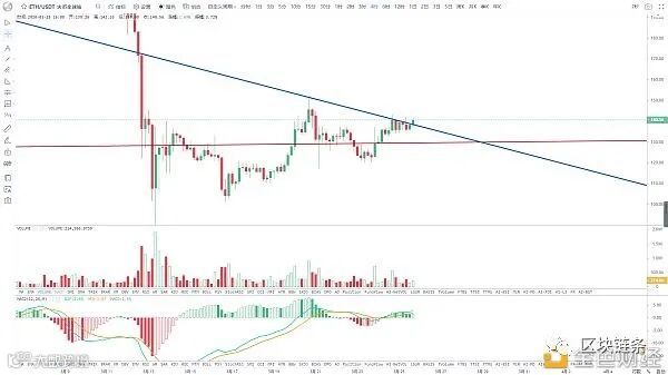 联动上涨,目前价格已上穿前期支撑转目前压制线,不过量能依旧未能显著放大,4小时MACD多头量柱也未显著增长,近期整体依然是区间波动行情,后面只有显著增量,才有望向上试探前高152美金,同时也是20日均线压制位,均线上5日线走平,中长期均线依旧保持向下,大方向趋势依旧偏空,所以目前只能算是反弹,反转还需要时间和空间进一步整理。