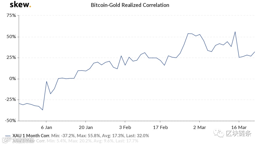 根据Skew的市场数据,尽管比特币与黄金之间的相关性在过去一周中从55%大幅下降至25%,但如今已经再次上升。在撰写本文时,这一比例为32%。