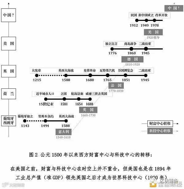东西方的发展都存在准周期的规律。西方的发展历史体现为财富中心在不同国家之间的流转,如图2 中财富中心流转方向所示。比较早的葡萄牙和西班牙共治地球,西班牙负责西半球的治理,葡萄牙则负责东半球,随后进入了荷兰的统治时期,接下来到了英国的迅速发展与统治,再后来美国占据了世界发展的主导权。