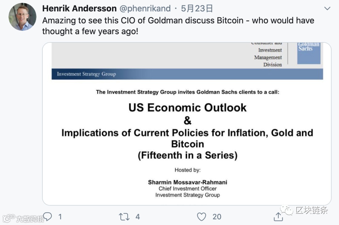 看到高盛的这位首席信息官讨论比特币,真是太神奇了!——Henrik Andersson