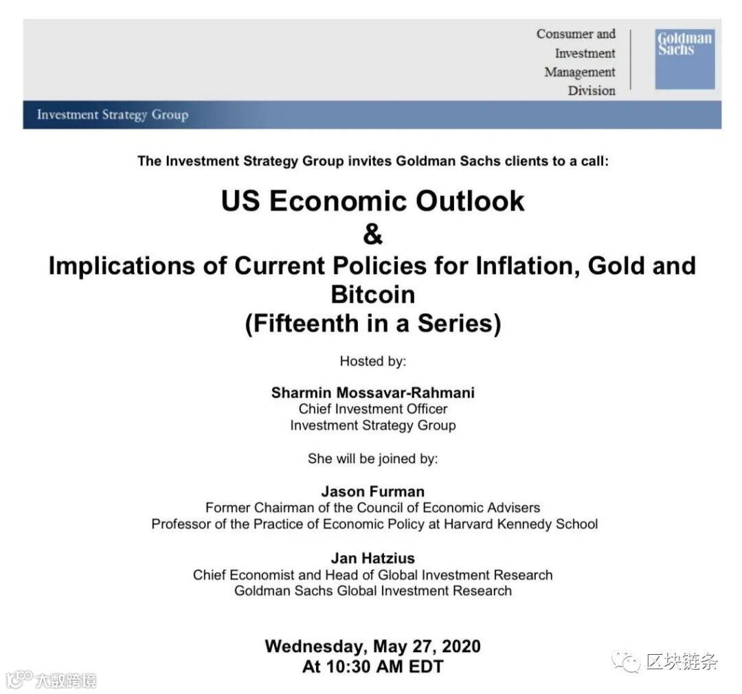 跨国投资银行巨头高盛将在5月27日为其客户举办比特币电话会议。