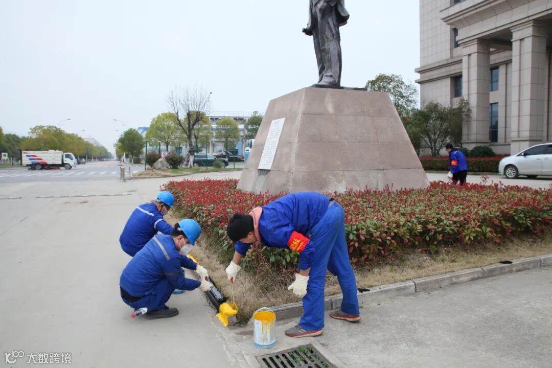 另一组分工协作,首先对新建四联跨一侧的路缘石和茅以升铜像四周的泥土和杂草进行清除,随后按黄白相间的方式对路缘进行警示标识涂刷,共涂刷路缘石长约400米,同时还对办公楼前的各类标识牌进行恢复并加固,让其更好地发挥作用。