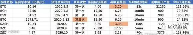 从上图可看出,除了比特币之外,其余币种皆为首次迎来减半。而以太经典(ETC)、达世币(DASH)在减产后的区块奖励并未减半,而是分别少幅下降为3.20及3.33。