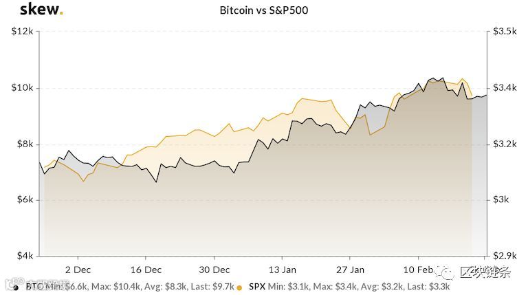 下图显示了比特币与标准普尔500指数(S&P 500)之间的走势差异。