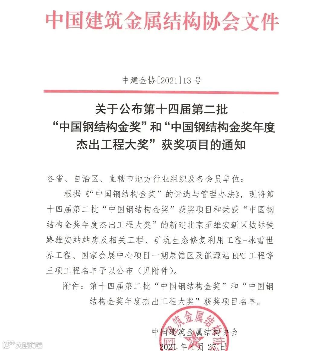“中国钢结构金奖”是全国钢结构行业内的国家优质工程奖项,代表项目的钢结构工程质量处于全国最高水平。
