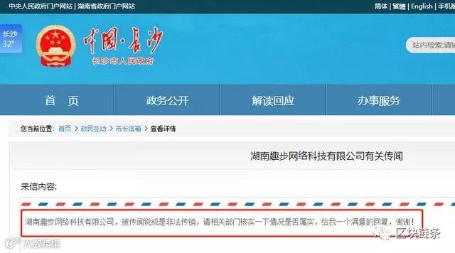 近日,有网友在长沙市人民政府的官方网站上,给市长信箱投了一封信,信的内容为:“湖南趣步网络有限公司,被传闻说成是非法传销,请有关部门核实一下情况是否属实,给我一个满意的回复,谢谢!”