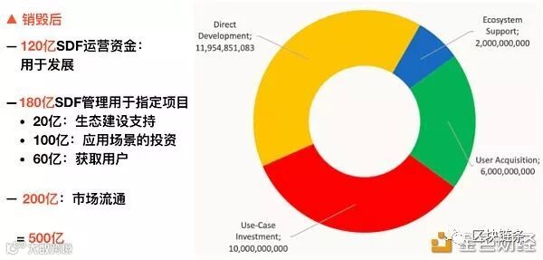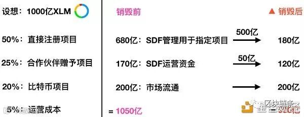 根据官方文件,在本次销毁之前,200亿代币在市面流通,170亿在SDF的运营资金池中,680亿由SDF管理用于指定项目的发放。本次SDF销毁了50亿运营资金,剩余120亿在SDF的运营资金池中。同时,SDF决定停止Stellar全球赠予项目(针对个人空投)和合作伙伴赠予项目,销毁680亿项目发放中的500亿,剩余180亿继续用于未来其它项目的代币发放。