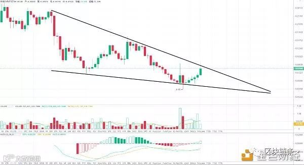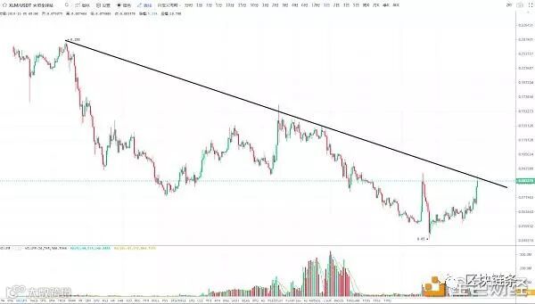 从周线来看,XLM近一年时间在一个大级别的下降三角形内运行,在9月23日触及下边线支撑,并收出一根超长下影线后,市场上出现了一定量的抄底资金进场接筹,至目前连续6周的时间持续向上反弹,整体走势比较强势,形态上目前最高向上插针至三角上沿,价格已站上周线布林中轨0.074美元上方,然后遇阻小幅回落至目前0.08美元附近,周线MACD绿柱逐渐增强,快慢线水下金叉,RSI与动量OBV指数抬升,后续有进一步走强的趋势,后面若能有效突破三角上沿,那么将会逆转将近一年时间的下降趋势,量能配合的话,有望迎来新一轮的反转拉升行情。