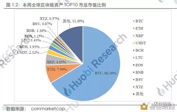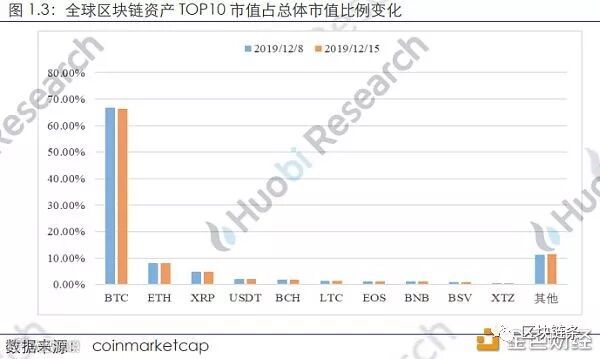 TOP10项目市值下跌、占比保持稳定。12月15日,TOP10资产项目市值为1726.99亿美元,较上周下跌5.20%,占区块链资产总市值比例为88.51%,环比下跌0.3个百分点。TOP10项目的市值占比基本稳定,BTC本周市值占比66.36%,比上周占比下跌0.35个百分点。