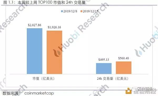 本周区块链资产总市值比上周下跌4.88%,TOP100项目中77个项目市值有不同程度下跌。据coinmarketcap数据,截止2019年12月15日,全球区块链资产总市值达1951亿美元,环比上周下跌4.88%。前100项目总市值为1926亿美元,下跌5.02%。其中KBC市值涨幅最大,市值较上周上涨85.36%,市值排名从第52名上升到第38名;EKT市值跌幅最大,较上周下跌31.23%,市值排名从49名下降到第60名。本周共有4个新项目进入TOP100,包括SLV(Silverway市值上涨47.61%,排名从137名上升至100名),ZEN(Horizen市值上涨20.66%,排名从110上升至89名),FAB (FABRK市值上涨18.46%,排名从113上升至98名),MB (MineBee市值下跌4.38%,排名从102上升至99名)。12月15日,Bitcoin价格为7152.30美元,较上周下跌5.38%,Ethereum价格为143.11美元,较上周下跌5.32%。