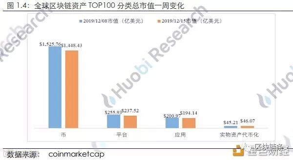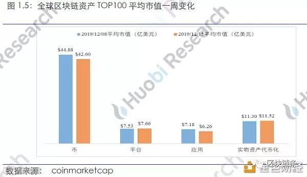 本周全球区块链资产TOP100项目分类组成稳定。2019年12月15日,在市值排名前100的项目中,币类项目不变,应用类项目增加3个,平台类项目减少3个,实物代币资产类项目不变。市值占比最大为币类,占比75.20%。