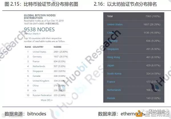 比特币验证节点数环比上涨、以太坊验证节点数环比下降。截止2019年12月15日,比特币验证节点达到9538个,环比上涨1.04%,其中美国有2461个节点,占比25.80%;德国有1937个节点,占比20.31%;中国排名第八,有279个节点,占比2.93%。