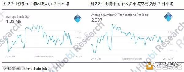 本周比特币区块平均大小上涨、区块平均交易次数下降,以太坊的区块平均大小下降,区块平均交易次数下降。根据blockchain.info数据计算,2019年12月9日至12月15日,比特币本周每个区块的平均大小为1.03MB,环比上涨4.04%,每个区块的平均交易次数为2097次,环比下降0.94%。