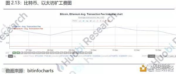 本周比特币矿工费下降、以太坊矿工费下降。截止2019年12月15日,比特币当日平均每笔矿工费为0.377USD,环比下跌21.29%,以太坊每笔矿工费为0.0891USD,环比下跌6.11%。