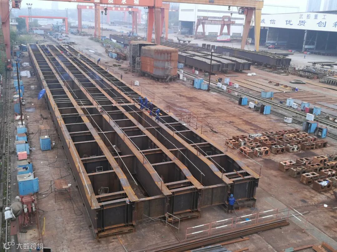 厦门第二东通道A5B标项目总吨位4.85万吨,重工股份双柳厂区负责单元件制造,扬中基地负责钢箱梁小节段、大节段总拼,钢箱梁总拼制造划分为4个联次,共计156个小节段,小节段总拼成16个大节段后,运往桥址进行吊装。