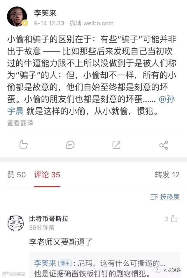李笑来在自己的微博中表示:“小偷和骗子的区别在于:有些“骗子”可能并非出于故意 —— 比如那些后来发现自己当初吹过的牛逼能力跟不上所以没做到于是被人们称为“骗子”的人;但,小偷却不一样,所有的小偷都是故意的,他们自始至终都是刻意的坏蛋。小偷的朋友们也都是刻意的坏蛋…… @孙宇晨 就是这样的小偷,从小就偷,惯犯。 ”