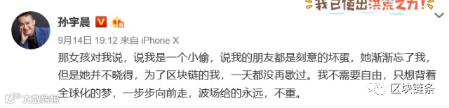 对此,孙宇晨在微博上做出了回应称,“那女孩对我说,说我是一个小偷,说我的朋友都是刻意的坏蛋,她渐渐忘了我,但是她并不晓得,为了区块链的我,一天都没再歇过。我不需要自由,只想背着全球化的梦,一步步向前走,波场给的永远,不重。 ”
