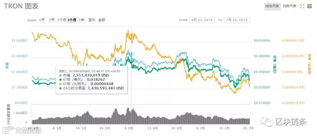 Coin Market Cap网站显示,截至7月23日发稿时间,孙晨宇创立的波场TRON币,为0.173995人民币,下跌-14.30%。从6月4日,孙宇晨高调宣布以破纪录457万美元拍下巴菲特20周年慈善午宴到现在,TRON价格已下跌近30%,市值跌去了59亿元。