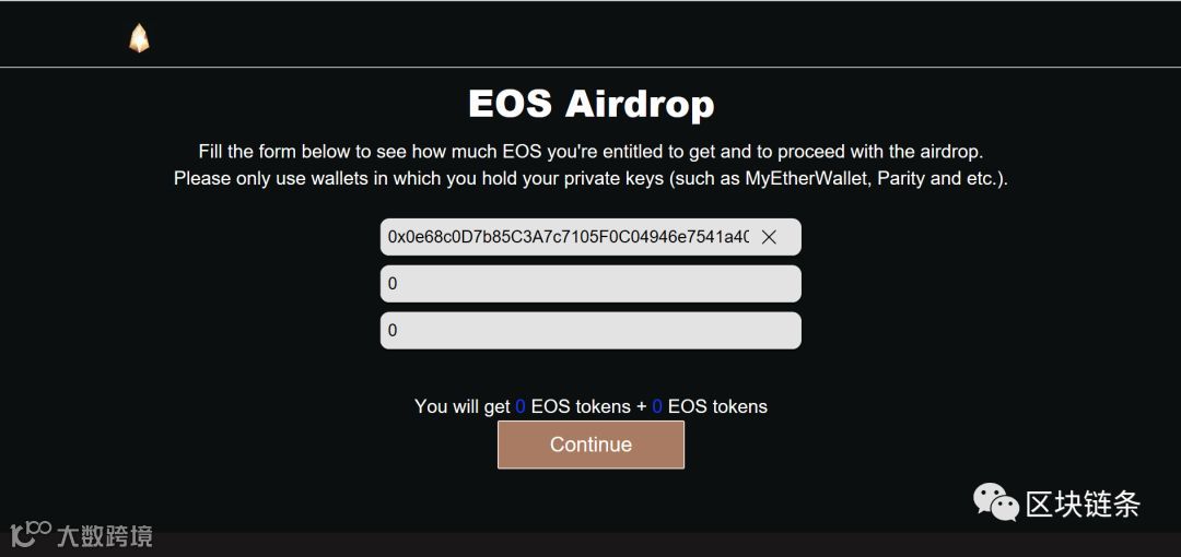 骗局一: 黑客通过钓鱼邮件 airdrop@eosmailer.io 发送假冒空投信息, 引导用户进入假冒的 EOS 空投网站 https://ẹos.com/airdrop/ , 诱导用户进入假冒的 MyEtherWallet 钱包, 从而盗取用户的资产。这样假冒的空投网站非常难以区分。可以看到这个假冒网站在单词下边有一个点, 使得用户很难辨认。