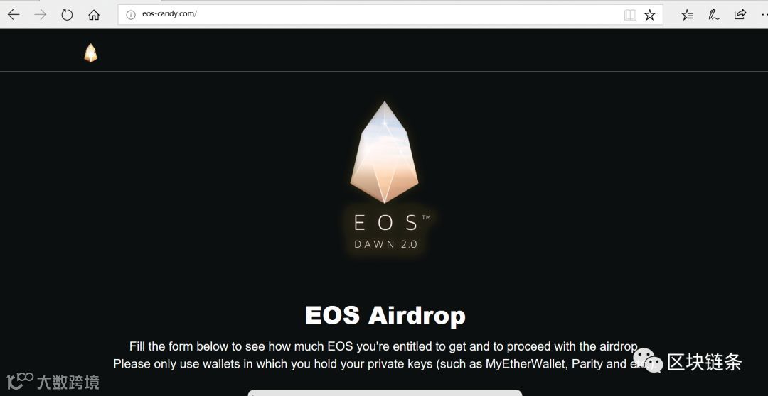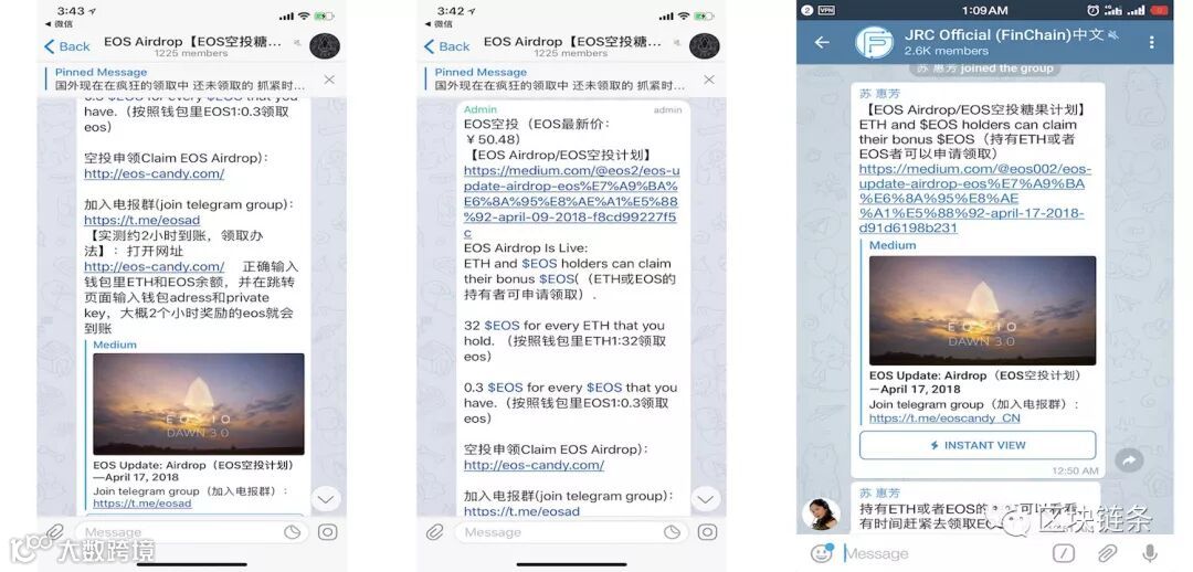 骗局二: 在 Telegram 里宣传 EOS 空投, 并且引导用户进入 EOS 钓鱼网站 http://eos-candy.com/, 输入私钥钱包就会被盗。 下面是骗子的电报群: