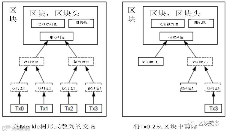 如果最近的交易已经被纳入了足够多的区块之中,那么就可以丢弃该交易之前的数据,以回收硬盘空间。为了同时确保不损害区块的随机散列值,交易信息被随机散列时,被构建成一种Merkle树(Merkle tree)[7] 的形态,使得只有根(root)被纳入了区块的随机散列值。通过将该树(tree)的分支拔除(stubbing)的方法,老区块就能被压缩。而内部的随机散列值是不必保存的。