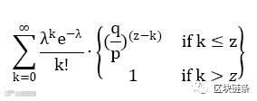 假定p>q,那么攻击成功的概率就因为区块数的增长而呈现指数化下降。由于概率是攻击者的敌人,如果他不能幸运且快速地获得成功,那么他获得成功的机会随着时间的流逝就变得愈发渺茫。那么我们考虑一个收款人需要等待多长时间,才能足够确信付款人已经难以更改交易了。我们假设付款人是一个支付攻击者,希望让收款人在一段时间内相信他已经付过款了,然后立即将支付的款项重新支付给自己。虽然收款人届时会发现这一点,但为时已晚。 收款人生成了新的一对密钥组合,然后只预留一个较短的时间将公钥发送给付款人。这将可以防止以下情况:付款人预先准备好一个区块链然后持续地对此区块进行运算,直到运气让他的区块链超越了诚实链条,方才立即执行支付。当此情形,只要交易一旦发出,攻击者就开始秘密地准备一条包含了该交易替代版本的平行链条。 然后收款人将等待交易出现在首个区块中,然后在等到z个区块链接其后。此时,他仍然不能确切知道攻击者已经进展了多少个区块,但是假设诚实区块将耗费平均预期时间以产生一个区块,那么攻击者的潜在进展就是一个泊松分布,分布的期望值为: