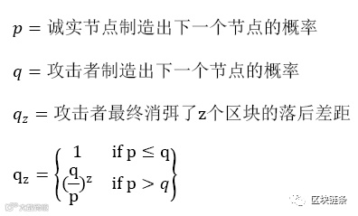 设想如下场景:一个攻击者试图比诚实节点产生链条更快地制造替代性区块链。即便它达到了这一目的,但是整个系统也并非就此完全受制于攻击者的独断意志了,比方说凭空创造价值,或者掠夺本不属于攻击者的货币。这是因为节点将不会接受无效的交易,而诚实的节点永远不会接受一个包含了无效信息的区块。一个攻击者能做的,最多是更改他自己的交易信息,并试图拿回他刚刚付给别人的钱。 诚实链条和攻击者链条之间的竞赛,可以用二叉树随机漫步(Binomial Random Walk)来描述。成功事件定义为诚实链条延长了一个区块,使其领先性+1,而失败事件则是攻击者的链条被延长了一个区块,使得差距-1。 攻击者成功填补某一既定差距的可能性,可以近似地看做赌徒破产问题(Gambler’s Ruin problem)。假定一个赌徒拥有无限的透支信用,然后开始进行潜在次数为无穷的赌博,试图填补上自己的亏空。那么我们可以计算他填补上亏空的概率,也就是该攻击者赶上诚实链条,如下所示[8] :